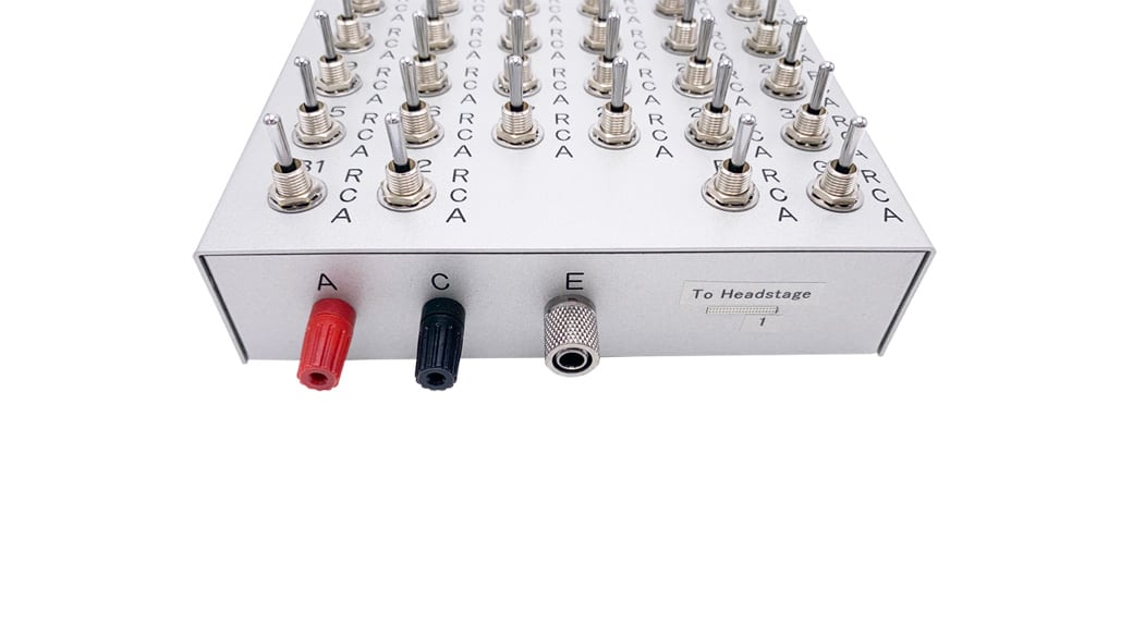電極とヘッドステージ(オペアンプ)の間に設置でき、各電極点を記録/刺激陽極/刺激陰極から選択できるようになっています。
