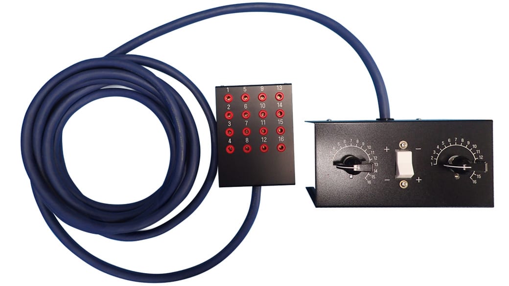 こちらに16極電極を接続し、任意の電極をセレクトして刺激が行えます。